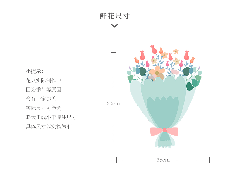 由于鮮花包扎的花藝師不同,可能在花束的形式和搭配上與圖片略有小的區(qū)別,但我們保證鮮花的主花材品種、新鮮程度、數量、顏色與說明一致,感謝您的理解。