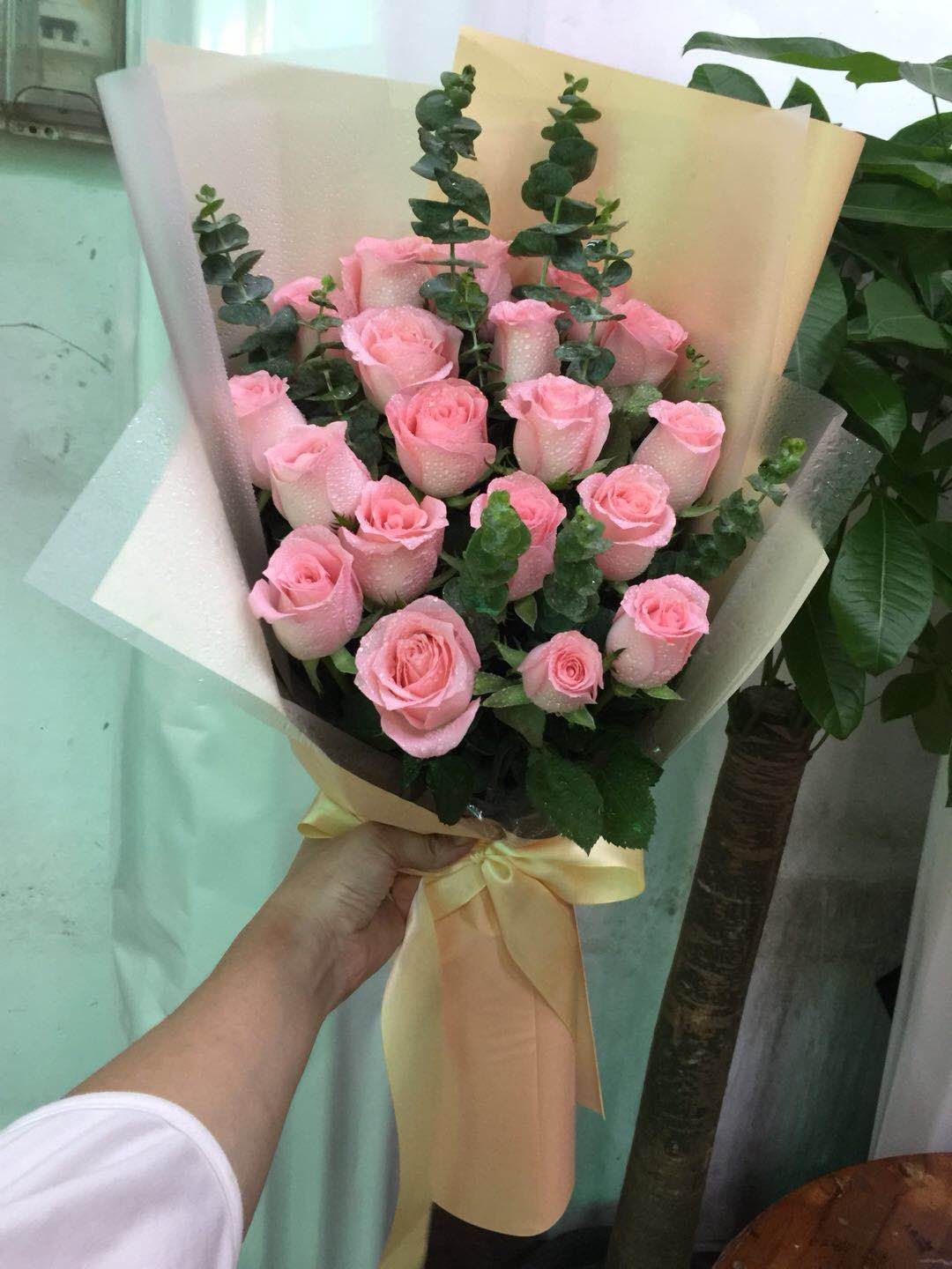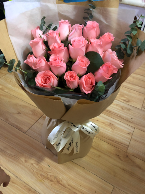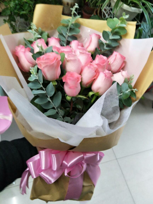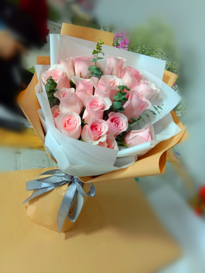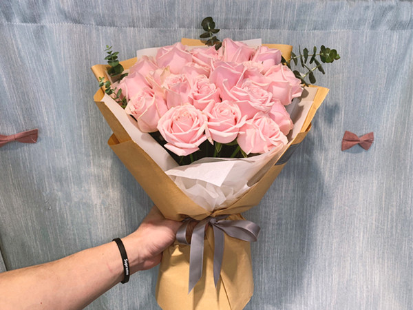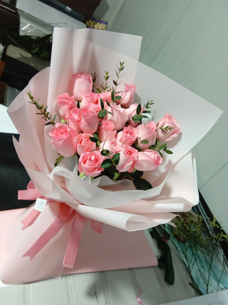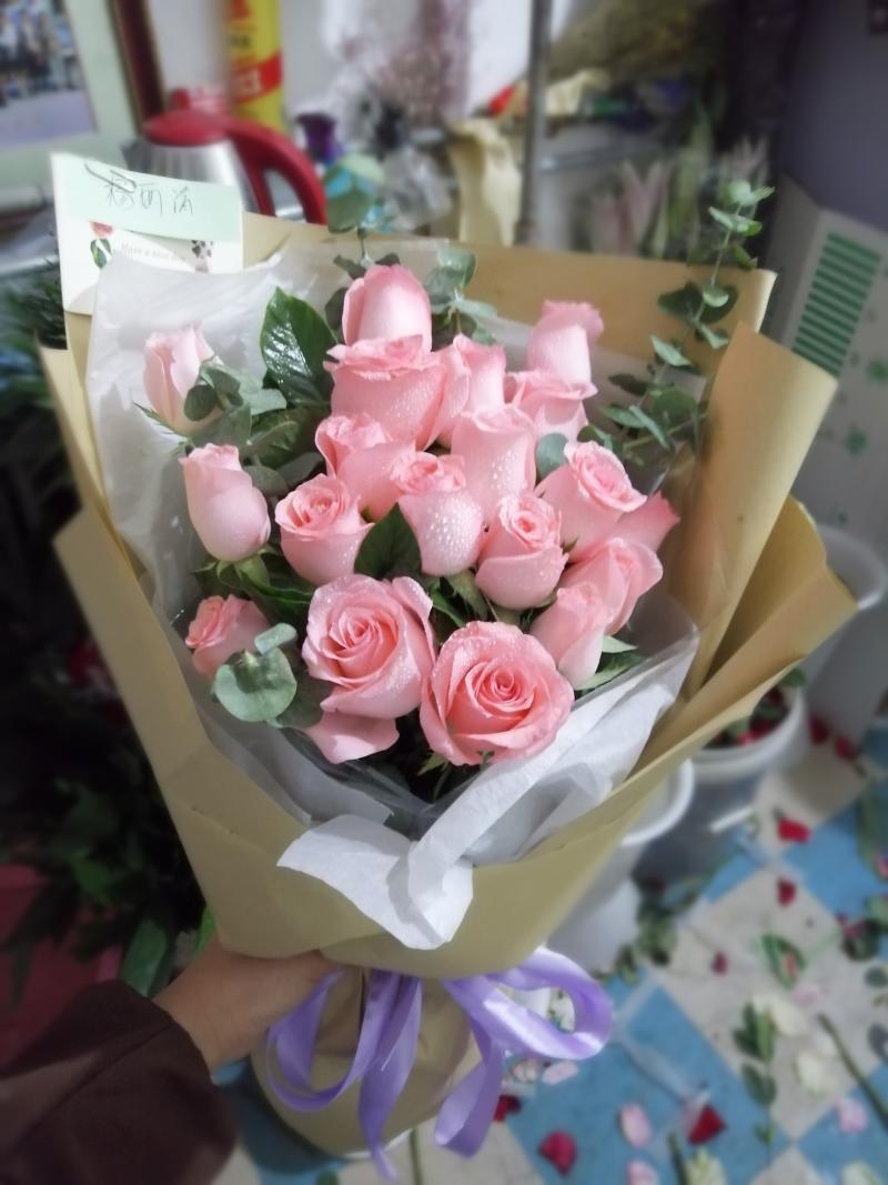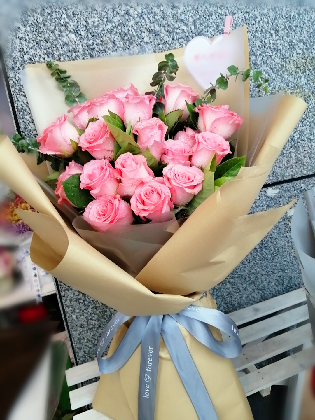 選了半天還是覺得粉玫瑰最好看,很有氣質(zhì),朵朵都很新鮮,掛著露水,一朵緊挨著一朵,下面不知名的綠色葉子搭配的也很好看,簡(jiǎn)單又不失精致,快遞配送都很及時(shí),下雨天也一樣,好評(píng)!