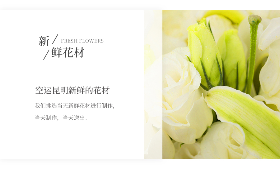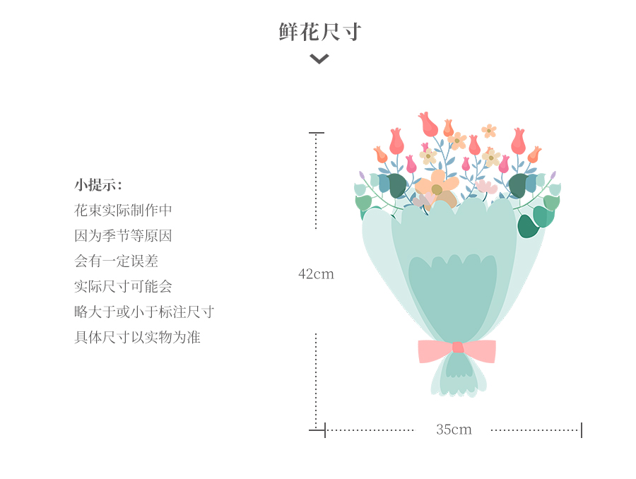 由于鮮花包扎的花藝師不同,可能在花束的形式和搭配上與圖片略有小的區(qū)別,但我們保證鮮花的主花材品種、新鮮程度、數(shù)量、顏色與說明一致,感謝您的理解。