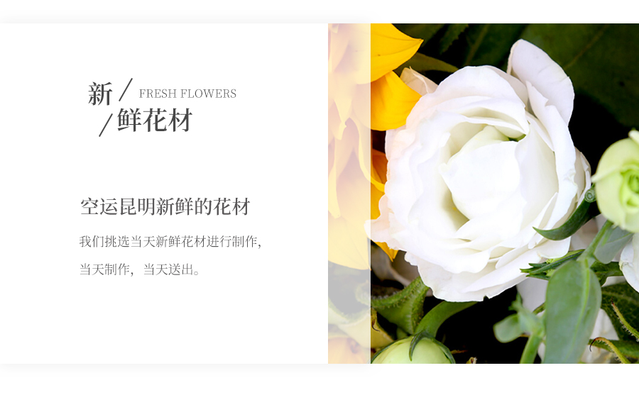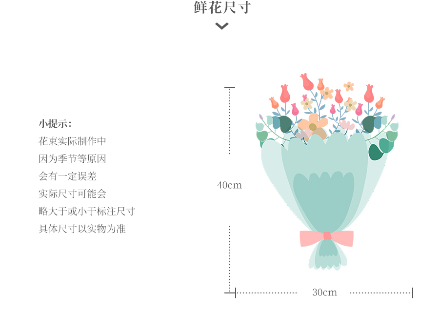 由于鮮花包扎的花藝師不同,可能在花束的形式和搭配上與圖片略有小的區(qū)別,但我們保證鮮花的主花材品種、新鮮程度、數(shù)量、顏色與說明一致,感謝您的理解。