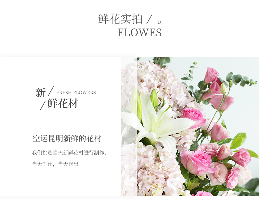 由于鮮花包扎的花藝師不同,可能在花束的形式和搭配上與圖片略有小的區(qū)別,但我們保證鮮花的主花材品種、新鮮程度、數量、顏色與說明一致,感謝您的理解。