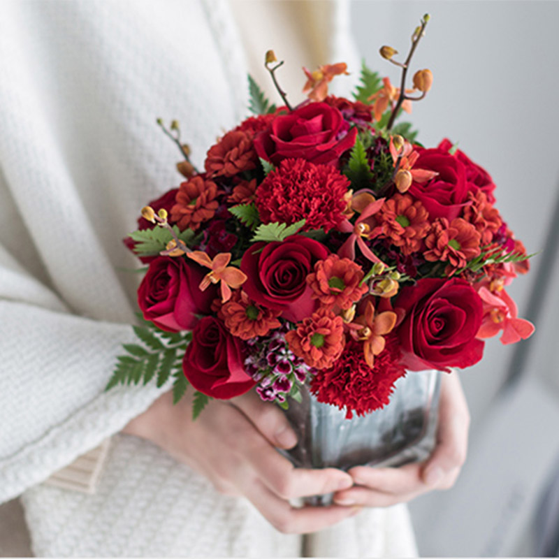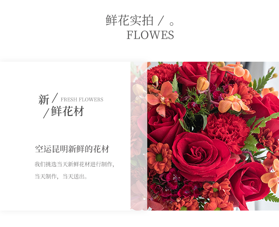 由于鮮花包扎的花藝師不同,可能在花束的形式和搭配上與圖片略有小的區(qū)別,但我們保證鮮花的主花材品種、新鮮程度、數(shù)量、顏色與說明一致,感謝您的理解。