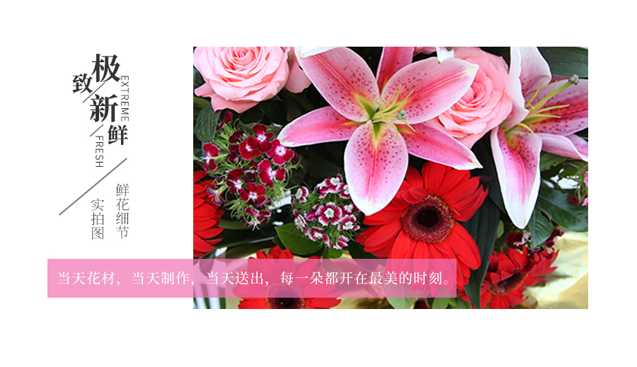 由于鮮花包扎的花藝師不同,可能在花束的形式和搭配上與圖片略有小的區(qū)別,但我們保證鮮花的主花材品種、新鮮程度、數量、顏色與說明一致,感謝您的理解。