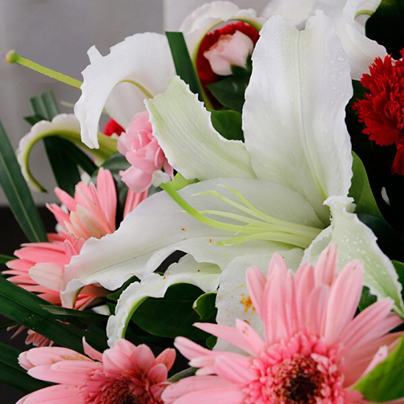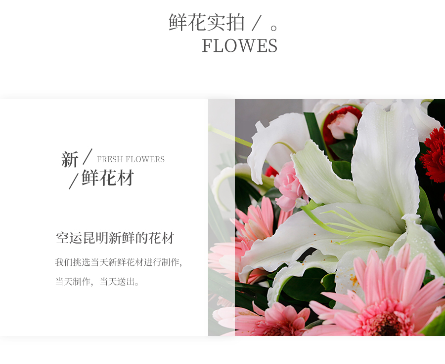 由于鮮花包扎的花藝師不同,可能在花束的形式和搭配上與圖片略有小的區(qū)別,但我們保證鮮花的主花材品種、新鮮程度、數(shù)量、顏色與說明一致,感謝您的理解。