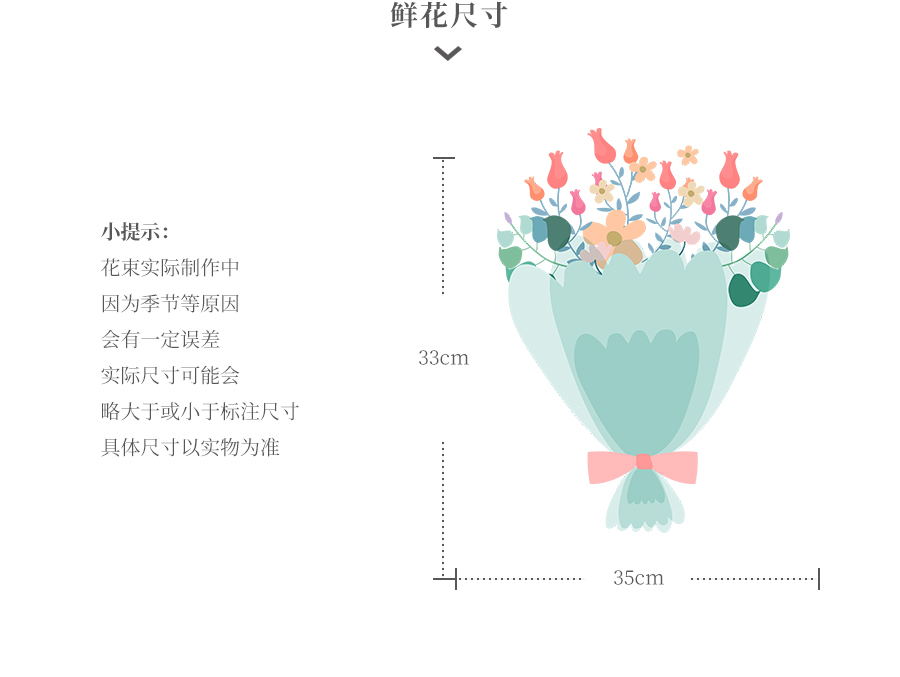 由于鮮花包扎的花藝師不同,可能在花束的形式和搭配上與圖片略有小的區(qū)別,但我們保證鮮花的主花材品種、新鮮程度、數(shù)量、顏色與說(shuō)明一致,感謝您的理解。