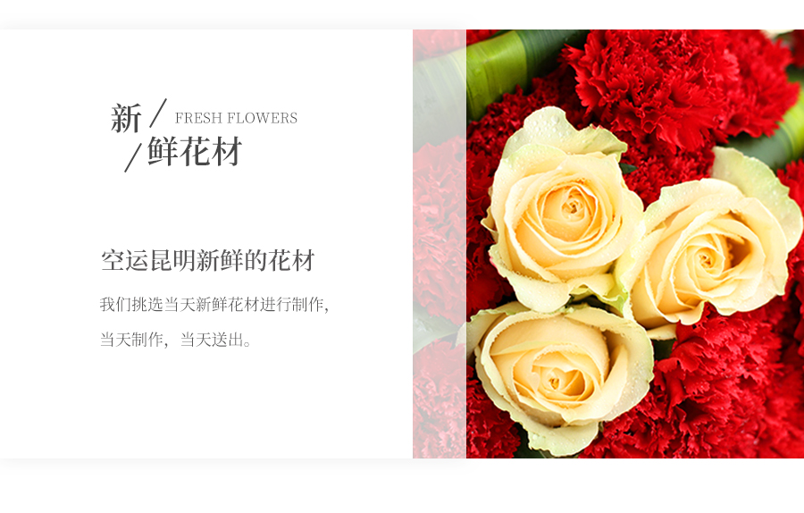 由于鮮花包扎的花藝師不同,可能在花束的形式和搭配上與圖片略有小的區(qū)別,但我們保證鮮花的主花材品種、新鮮程度、數(shù)量、顏色與說(shuō)明一致,感謝您的理解。